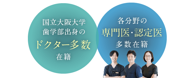 国立大阪大学歯学部出身のドクター多数在籍、各分野の専門医・認定医多数在籍